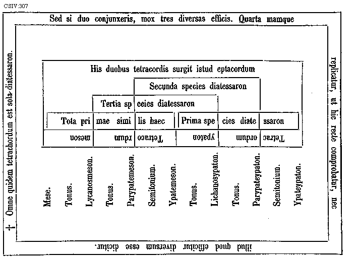 [307][CSIV:307; text: * Omne quidem tetrachordum est sola diatessaron. Sed si duo conjunxeris, mox tres diversas efficis. Quarta mamque replicatur, ut hic recte comprobatur, nec illud quod efficitur diversum esse dicitur. His duobus tetracordis surgit istud eptacordum, Secunda species diatessaron, Tertia speeies diatessaron, Tota primae similis haec, Prima species diatessaron, Tetracordum ypaton, Tetracordum meson, Mese. Tonus. Lycanosmeson. Parypatemeson. Semitonium. Ypatemeson. Lichanosypaton. Parypateypaton. Ypateypaton]