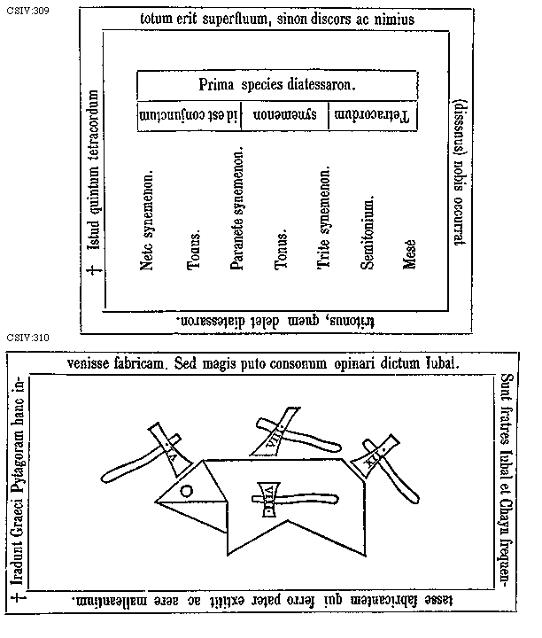 [CSIV:310; text: * Iradunt Graeci Pytagoram hanc invenisse fabricam. Sed magis puto consonum opinari dictum Iubal. Sunt fratres Iubal et Chayn frequentasse fabricantem qui ferro pater extitit ac aere malleantium. VI. VIII. VIII. XII.]