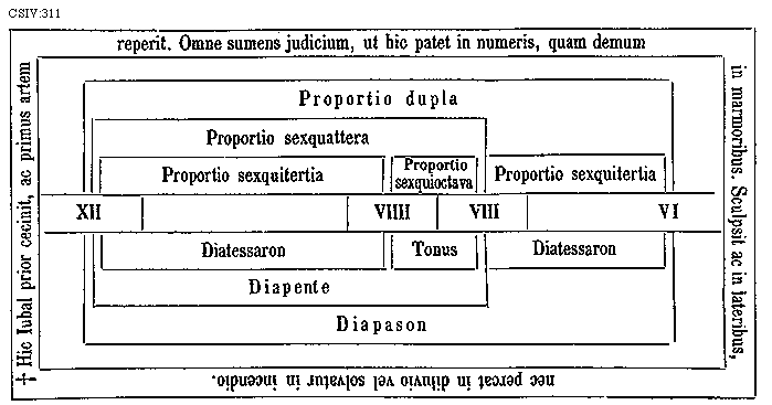 [CSIV:311; text: * Hic Iubal prior cecinit, ac primus artem reperit. Omne sumens judicium, ut hic patet in numeris, quam demum in marmoribus. Sculpsit ac in lateribus, nec percat in diluvio vel solvatur in incendio. Proportio dupla, Proportio sexquattera, Proportio sexquitertia, Proportio sexquioctava, XII VIIII VIII VI, Diatessaron, Tonus, Diapente, Diapason]