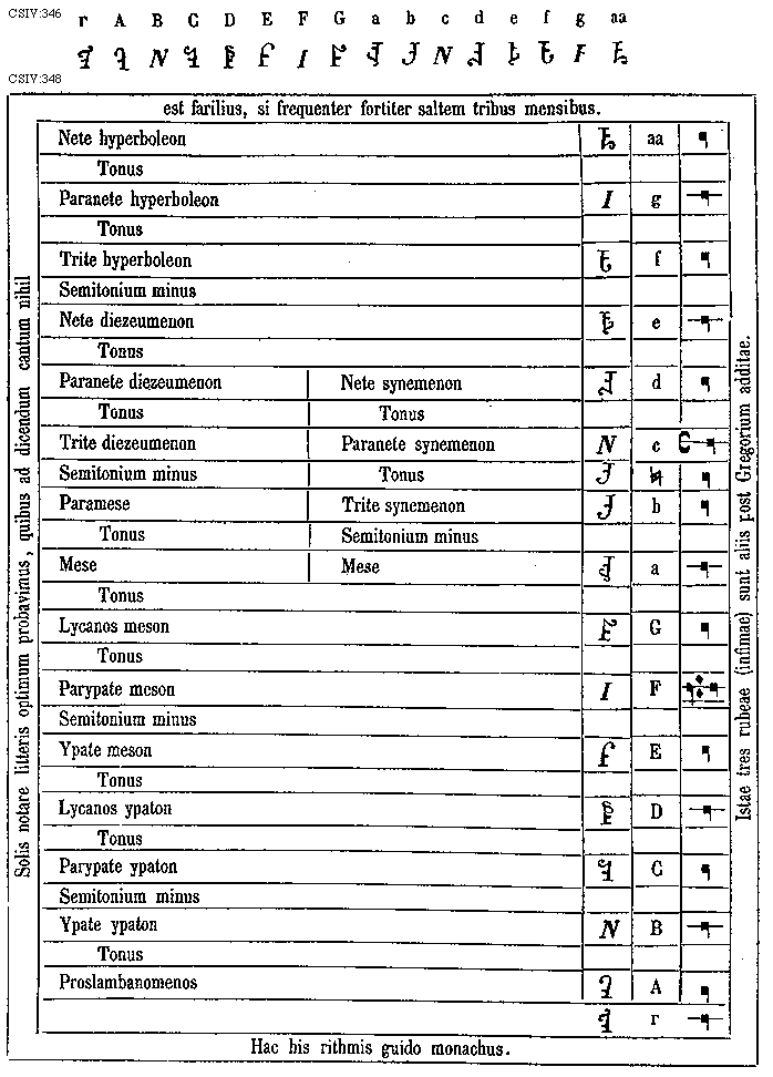 [348][CSIV:348; text: Solis notare litteris optimum probavimus, quibus ad dicendum cantum nihil est farilius, si frequenter fortiter saltem tribus mensibus. Istae tres rubeae (infimae) sunt aliis post Gregorium additae. Hac his rithmis guido monachus. Nete hyperboleon, aa, Tonus, Paranete hyperboleon, g, Trite hyperboleon, f, Semitonium minus, Nete diezeumenon, e, Paranete diezeumenon, Nete synemenon, d, Trite diezeumenon, Paranete synemenon c, [sqb], Paramese, Trite synemenon, [rob], Mese a, Lycanos meson G, Parypate meson F, Ypate meson E, Lycanos ypaton D, Parypate ypaton C, Ypate ypaton B, Proslambanomenos A; [Gamma]]
