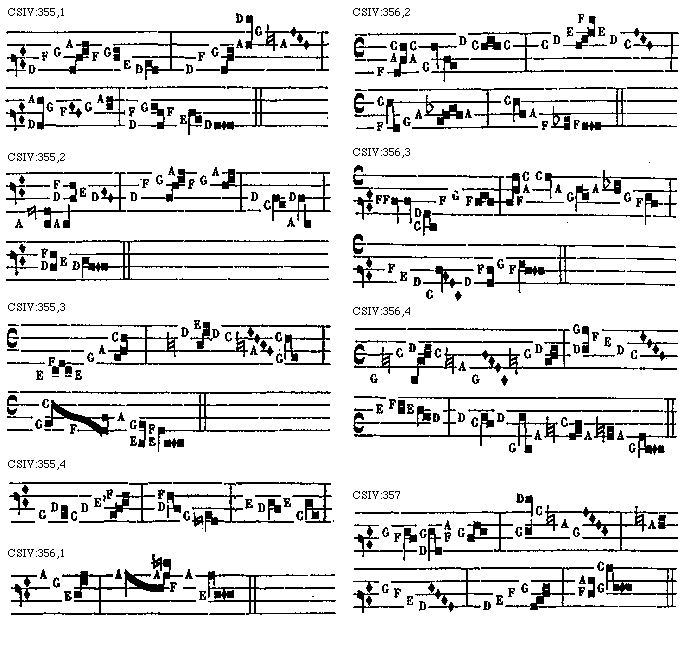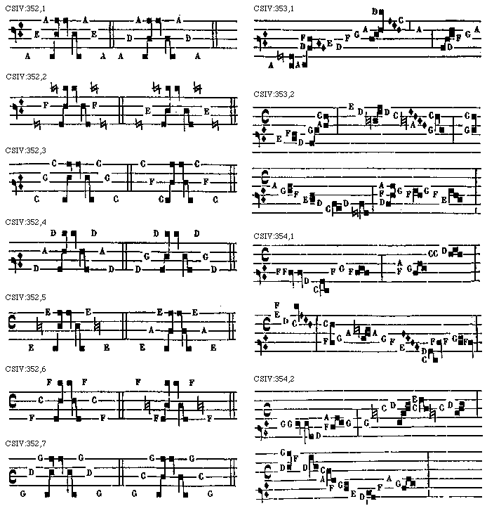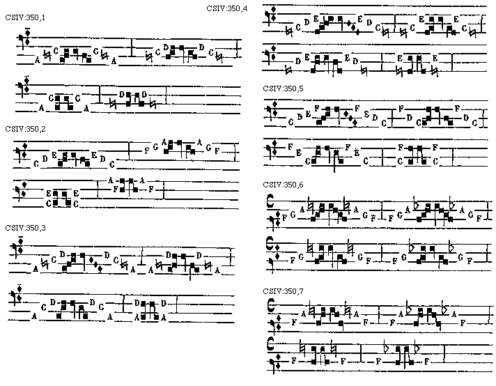 [CSIV:350,4; text: [sqb] C D E E D C [sqb] [sqb] C E E C [sqb] [sqb] D E E D [sqb] [sqb] E E [sqb]]