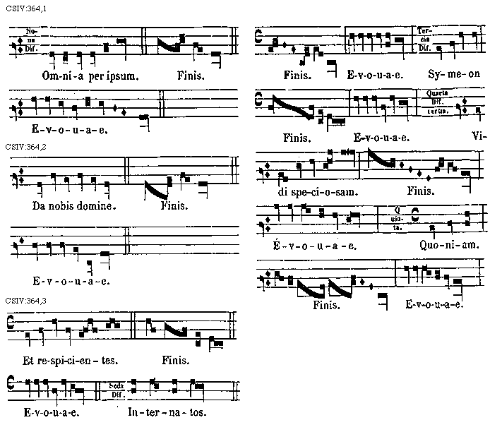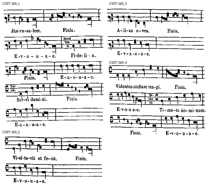 [CSIV:364,3; text: Et respicientes. Finis. Evouae. Secunda Differentia. Internatos. Finis. Evouae. Tercia Differentia. Symeon Finis. Evouae. Quarta Differentia. Tertia. Vidi speciosam. Finis. Evouae. Quinta. Quoniam. Finis. Evouae.]