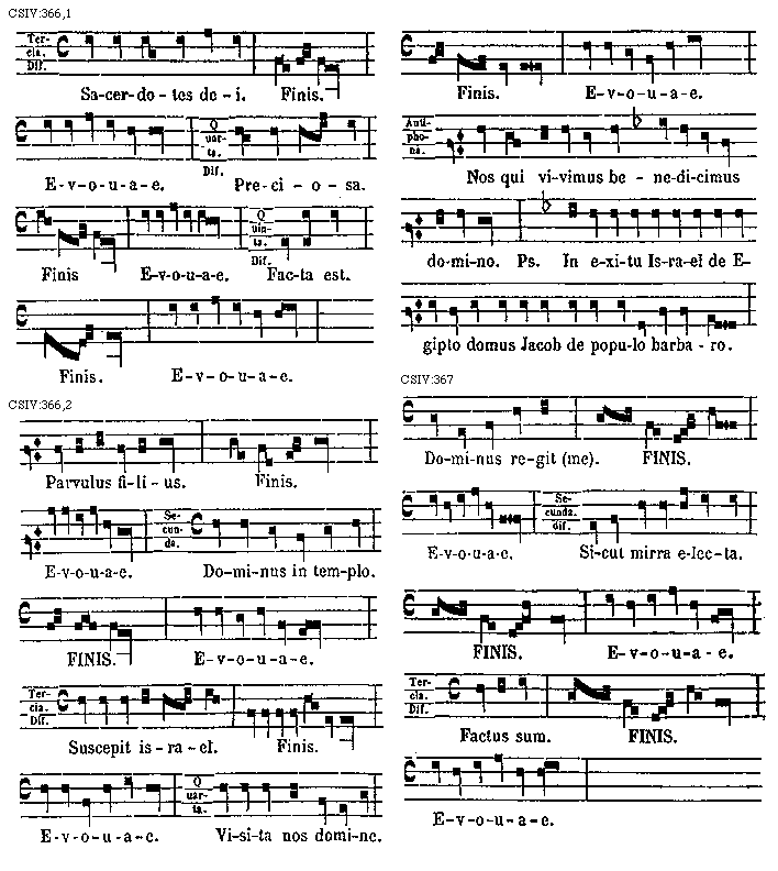 [CSIV:367; text: Dominus regit (me). Finis. Evouae. Secunda. Differentia. Sicut mirra electa. Finis. Evouae. Tercia. Differentia, Factus sum. Finis. Evouae.]
