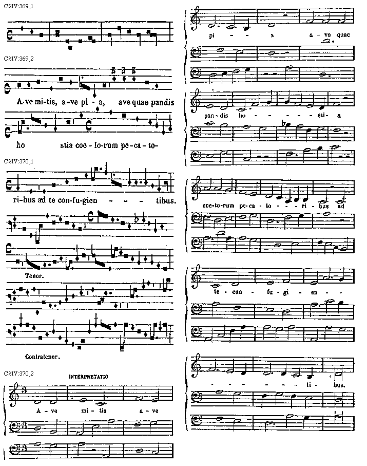 [CSIV:370,2; text: Interpretatio, Ave mitis ave pia ave quae pandis hostia coetorum pecatoribus ad teconfugientibus.]