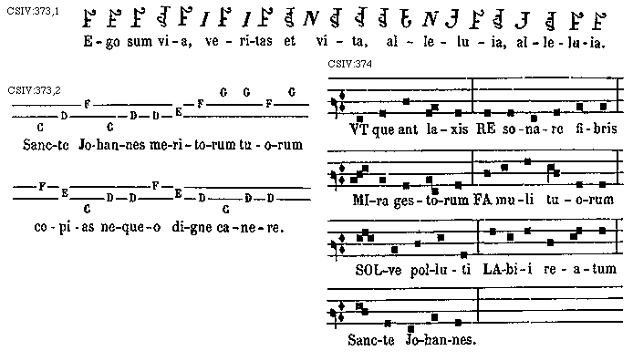 [CSIV:373,2; text: C D F C D D E F G G F G F E C D D F E D C D D Sancte Johannes meritorum tuorum copias nequeo digne canere.]