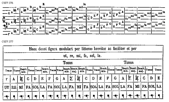 [CSIV:377; text: Haec docet figura modulari per litteras breviter ac faciliter et per ut, re, mi, fa, sol, la. Tonus Semit. min. Semit. maj. [Gamma] A [sqb] C D E F G A [rob]]