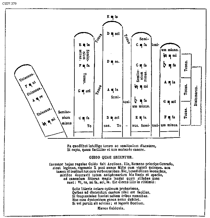 [379][CSIV:379; text: Unisonus. [Gamma] ut A re [sqb] mi Semitonium minus E la F fa Tonus G sol C fa E la D sol A la C fa [rob] fa A la F fa Diatessaron. Fa quodlibet intellige tonum ac semitonium discutere, Si cupis, quam facilliter et non mutando canere. GUIDO QUAE SECUNTUR. Inventor hujus regulae Guido fuit Aretinus. Ille, Romano principe Conrado, sicut legimus, regnante X post annos Mille cum viginti quinque, non tamen id instituit tot cum verbositatibus. Hic, benedictinus monachus, mirifice decoravit totum antiphonarium his lineis et spaciis, ad canendum litteras magis laudat quam sillabas quae sunt: Vt, re, mi fa, sol, la. Sic dicens illis in rithimis: Solis litteris notare optimum probavimus, Quibus ad discendum cantum nihil est facilius, Si frequentatae fuerint saltem tribus mensibus. Hoc esse dyatonicum genus nemo dubitet. Si vel parum sit sciolus; et legerit Boetium. Manus Guidonis.]