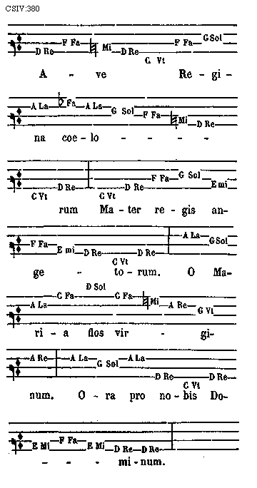 [CSIV:380; text: D Re F Fa [sqb] Mi C Vt G Sol A La [rob] Fa E mi C Fa D Sol A Re G Vt. Ave Regina coelorum Mater regis angetorum. O Maria flos virginum. Ora pro nobis Dominum.]