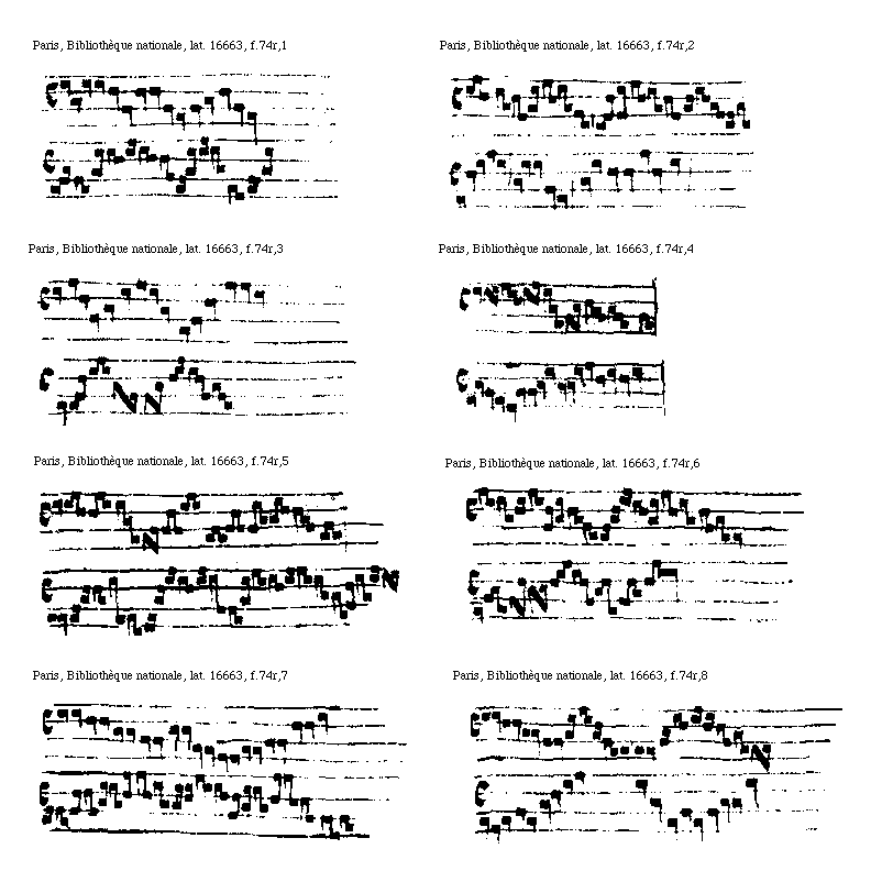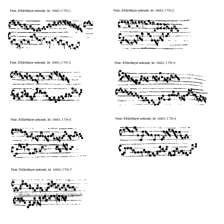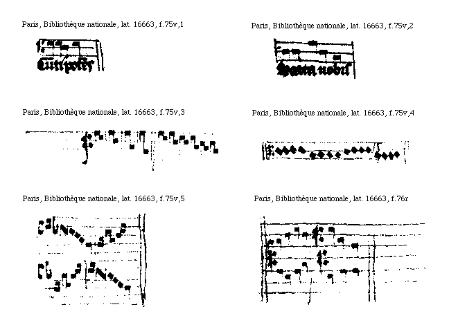 [f.75r]alicuius recte que longe et breues recte sumuntur debito modo: primo et principaliter. In non recta uero: sumitur longa et breuis non primo modo sed ex contingenti. Organum autem non rectum dicitur quicquid profertur per non rectam mensuram ut [aut ante corr.] dictum est superius. Et eius equippolencia: tantum se tenet in unissono usque ad finem alicuius [[p]] puncti ut secum conuenit secundum aliquam concordanciam. Et hoc sufficit de organo. quantum ad discantum. Longe et breues in organo tali modo dinoscuntur scilicet per consonanciam. per figuram per penultimam unde regula. Omne id quod accidit in aliquo secundum uirtutem consonanciarum: dicitur longum. alia regula quicquid figuratur longum secundum organa ante pausacionem uel loco consonancie: dicitur longum. alia regula Quicquid accipitur ante longam pausacionem uel ante perfectam concordanciam: dicitur esse longum. Sequitur de triplicibus. Triplum est: commixcio trium sonorum: secundum habitudinem sex concordanciarum scilicet unissonus diapason: et cetera. et hoc in eodem tempore. Et ista est: [[tonius]] [communis corr. in marg.] descipcio [descripcio corr. supra lin.]. Specialiter autem: sic describitur. Triplum est cantus proporcionatus aliquis: conueniens et concordans cum discantu. Et sic est tercius cantus. ad iunctus duobus unde prima regula. Triplum specialiter [spirituaaliter ante corr.] sumptum debet ex remoto [extremoto ante corr.] concordare: primo et secundo cantui nisi fuerit concordancia in simul per sonum reductum: quod sibi equipollet. Proprium est diapason: et infra. Remotum: est duplex diapason: et infra usque ad diapason. Remotissimum: est triplex diapason: et infra usque ad duplex diapason. Diapason dicitur dupla. diapente cum [[diapente]] diapason dicitur tripla: bis diapason quadrupla Diapente cum bis diapason sexcupla triplex diapason quod uix reperitur nisi instrumentis aflatu: dicitur octupla. Et ista probantur maxime per magnam figuram: musicalem. Multa in predictis dimisumus que partim continentur in triplicibus nunc prepositis et partim in quadruplicibus [quadrupplicibus ante corr.] post positis: primum est de errore. secundum de eorundem colore: tercium est: in posicione breuium: inpropriis locis. quartum est de nobilitate soni. quintum est: de dissonancia. ut sic concordancia. sextum est: de copulacione soni. Error tercii soni quando ordinamus sonos male conuenienstes: Quod per quatuor regulas cognoscimus. Quarum prima: talis est. Quociens ascendimus per tonos integros: et postea iungendo semitonium intonum [intonoum ante corr.] conuertitur et ultimus tonus in semitonium Quod fit. mediante synemenon ut patet in exemplo