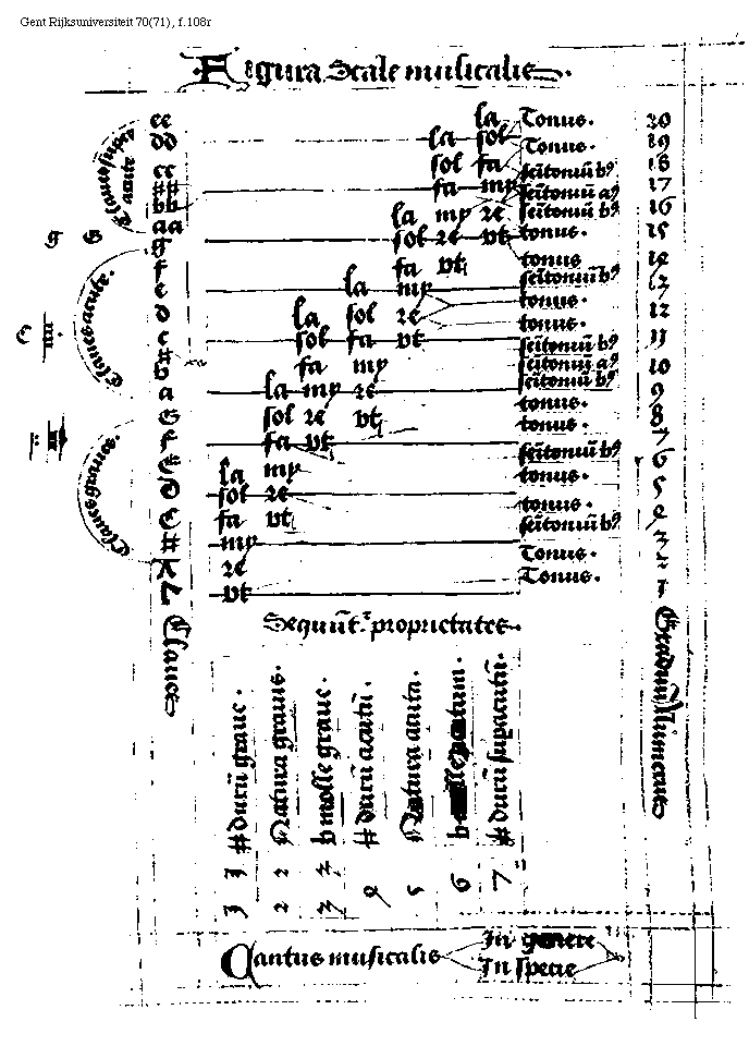 [f.108r][Gent, Rijksuniversiteit, 70(71), f.108r; text: Figura Scale musicalis. Claues graues. Claues acute. Claues superacute, Claues, [Gamma], A, [sqb], C, D, E, F, G, a, b, c, d, e, f, g, aa, bb, [sqb][sqb], cc, dd, ee, ut, re, my, fa, sol, la, Tonus. semitonium minus, semitonium maius, Graduum Numerus, 1, 2, 3, 4, 5, 6, 7, 8, 9, 10, 11, 12, 13, 14, 15, 16, 17, 18, 19, 20, Sequuntur proprietates. 1 1 [sqb] durum graue. 2 2 Natura grauis. 3 3 b molle graue. 4 [sqb] durum acutum. 5 Natura acuta. 6 b molle acutum. 7 [sqb] durum superacutum. Cantus musicalis, In genere, In specie]