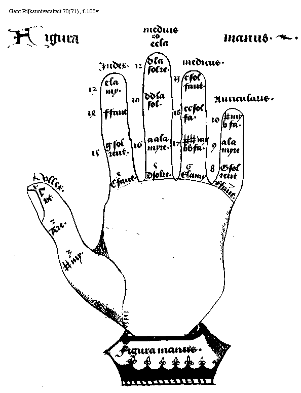 REferunt quedam: quod ipse dominus Guido monachus ordinis beati benedicti: qui scalam musicalem dicitur inuenisse considerans 14. articulos siue articulorum iuncturas esse in digitis manus hominum et quisque summitates digitorum: que quidem iuncture et summitates simul iuncte aut numerate faciunt 19. Applicauit singula nomina graduum scale musicalis singulis iuncturis interioribus et summitatibus digitorum manus sinistre: ut iuuenes ipsam scalam musicalem per hoc clarius intelligerent: et leuius corde retinerent: Ita quod in summitate pollicis posuit gammaut qui est infimus gradus musicalis. In articulo autem medio pollicis euisdem posuit Are. et in radice euisdem [sqb]my. Item in radice indicis posuit Cfaut et radice medij digiti posuit Dsolre. In radice media Elamy. et in radice auricularis Ffaut A qua radice auricularis per singulos articulos euisdem digiti usque ad summitatem ascendendo gradatim posuit Gsolreut alamire bfa[sqb]my. A qua summitate auricularis ad summitates singulorum digitorum ordinate procedendo posuit csolfaut dlasolre elamy. et diuide a summitate indicis per duos descendentes articulos posuit ffaut gsolreut. A quo articulo indicis proximo radici iterum recirculando uel regirando per articulum interiorem medij proximum radice usque
