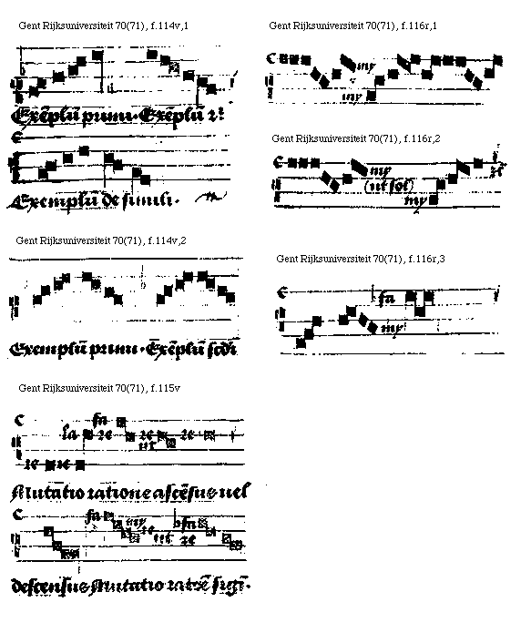 [f.119v]cantatur per secundum bmolle ad ut de ffaut: et my cantatur per tercium [sqb]durum ad ut de gsolreut: et nullas habet mutationes per exceptionem a secunda regula. ccsolfa habet vnam clauem scilicet cc paruam sed duplicatam: et duas voces seu notas scilicet sol et fa: et duas habet mutationes per secundam regulam scilicet solfa fasol. Sol cantatur per secundum bmolle ad ut de ffaut: Et fa cantatur per tercium [sqb]durum ad ut de gsolreut. Sol mutatur in fa desecendendo de secundo cantu bmollari in tercium cantum [sqb]duralem. Et fa mutatur in sol etiam descendendo de tercio cantu [sqb]durali in secundum cantum bmollarem. ddlasol habet vnam clauem scilicet dd. paruam sed duplicatam et duas voces siue notas scilicet la et sol. et habet duas mutationes per secundam regulam scilicet lasol solla. La cantatur per secundum bmolle ad ut de ffaut. et sol cantatur per tercium [sqb]durum ad ut de gsolreut. La mutatur in sol descendendo de secundo cantu bmollari in tercium cantum [sqb]duralem Et sol mutatur in la descendendo de tercio cantu [sqb]durali in secundum cantum bmollarem Exempla vtrobique patent hic inferius descripta.