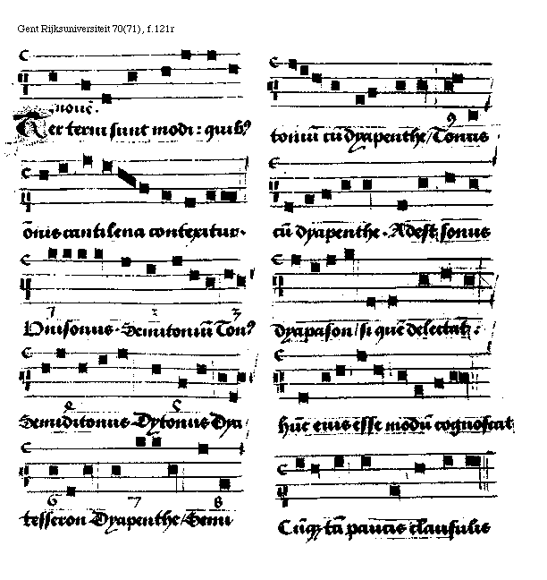 [Gent, Rijksuniversiteit, 70(71), f.121r; text: novem. Ter terni sunt modi: quibus omnis cantilena contexitur. Vnisonus. Semitonium Tonus Semiditonus Dytonus Dyatesseron Dyapenthe Semitonium cum dyapenthe Tonus cum dyapenthe. Adest sonus dyapason si quem delectat: hunc eius esse modum cognoscat Cumque tam paucis clausulis, 1, 2, 3, 4, 5, 6, 7, 8, 9]