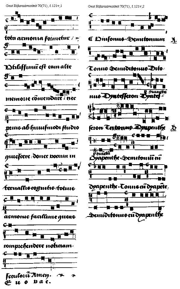 [Gent, Rijksuniversiteit, 70(71), f.121v,2; text: Vnisonus. Semitonium [A. in marg.] Tonus Semiditonus Ditonus Dyatesseron Dyatesseron [per coniunctam supra lin.] Tritonus Dyapenthe [B. in marg.] Dyapenthe [per coniunctam supra lin.] Semitonium cum dyapenthe. Tonus cum dyapente Semiditonus cum dyapenthe]
