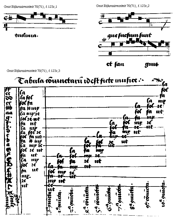 [Gent, Rijksuniversiteit, 70(71), f.123r,3; text: Tabula coniunctarum id est ficte musice: [Gamma], A, [sqb], C, D, E, F, G, a, b, c, d, e. f. g. aa, [sqb]b, cc, dd, ee, Ff, ut, re, my, fa, sol, la, fa ut, sol re, la my, sol re ut, la my re, fa [sqb] my, sol fa ut, la sol re, sol fa, la sol]
