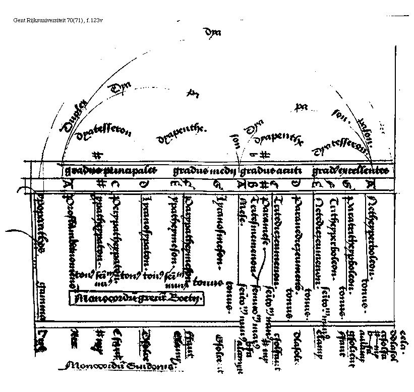 [f.122r][Gent, Rijksuniversiteit, 70(71), f.122r; text: Ditonus cum dyapenthe. Dyapason. et cetera]