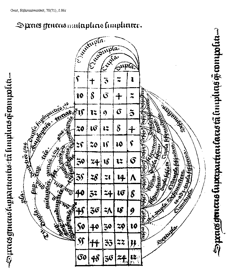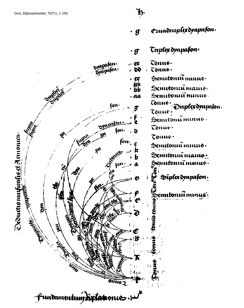 [f.105r][Gent, Rijksuniversiteit, 70(71), f.105r; text: H, g, ee, dd, cc, [sqb][sqb], bb, aa, f, e, d, c, [sqb], b, a, G, F, E, D, C, A, [Gamma], Quadruplex dyapason, Triplex dyapason. Tonus. Semitonium minus. Semitonium maius. Duplex dyapason. Simplex dyapason. Deductio musicalis et Armonica. semiditonus, dyatesseron, dyapenthe, ditonus, dyapason. Tritonus, tonus cum dyapenthe, semiditonus cum dyapente, Semiditonus supra dyapason. Dyapenthe cum dyapason. Dyapenthe supra dyapason. Dyapenthe supra duplicem dyapason. Tonus cum Dyapenthe supra duplicem dyapason. Fundamentum Relationis.]