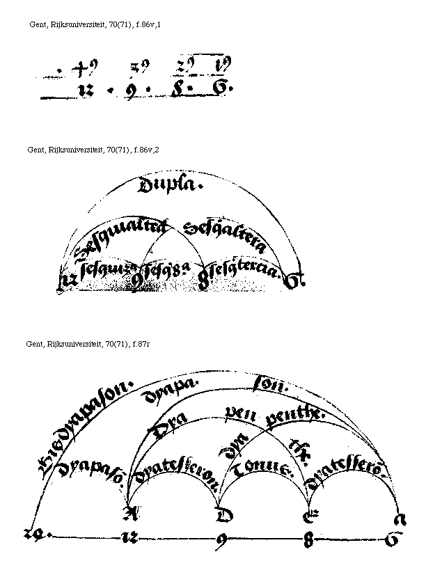 [Gent, Rijksuniversiteit, 70(71), f.87r; text: Bisdyapason. dyapason. Dyapenthe. dyatesseron. Tonus. 24. 12, 9, 8, 6, A, D, E, a]