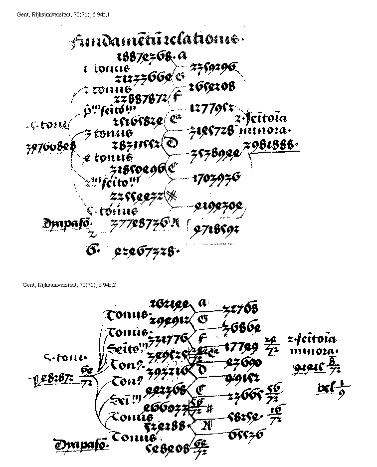 [Gent, Rijksuniversiteit, 70(71), f.94r,1; text: Fundamentum relationis. 1 tonus, 2 tonus, primum semitonium, 3 tonus, 4 tonus, secundum semitonium, 5 tonus, 6. quinque toni, Dyapason, duo semitonia minora. A, [sqb], C, D, E, F, G, a, 34766848, 18874368, 21233664, 22887872, 25165824, 28311552, 31850496, 33554432, 37748736, 42467328, 2359296, 2654208, 1277952, 3145728, 3538944, 1703936, 4194304, 4718592, 2981888.]