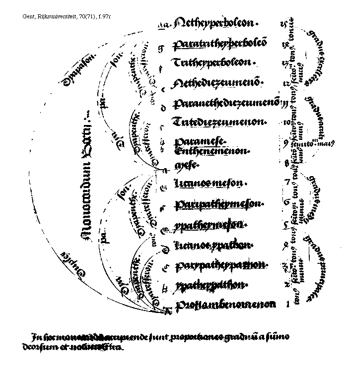 [Gent, Rijksuniversiteit, 70(71), f.97r; text: Duplex Dyapason. Monocordum Boetij:, Dyapason. Dyapenthe. Dyatesseron. Tonus. Netheyperboleon. Paratritheyperboleon, Tritheyperboleon. Nethediezeumenon. Paranethediezeumenon, Tritediezeumenon. Paramese. Enthenemenon. Mese. Licanos meson. Paripatheymeson. Ypatheymeson. Licanos ypathon. Parypatheypathon. Ypatheypathon. Proslambenomenon. aa. g, f, e, d, c, [sqb], b, a, G, F, E, D, C, A, gradus excellentes, gradus acuti, gradus medij, gradus principales, 1, 2, 3, 4, 5, 6, 7, 8, 9, 10, 11, 12, 13, 14, 15, tonus, semitonium minus, In hoc monocordo accipiende sunt proportiones graduum a summo deorsum et non econtra.]