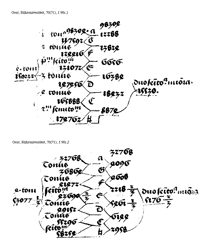 [Gent, Rijksuniversiteit, 70(71), f.98r,1; text: 1 tonus, 2 tonus, primum semitonium, 3 tonus, 4 tonus, secundum semitonium, quatuor toni, duo semitonia minora, a, G, F, E, D, C, [sqb], 159232, 98304, 117592, 124416, 131072, 147456, 165888, 174762, 12288, 13824, 6656, 16384, 18432, 8874, 15530]