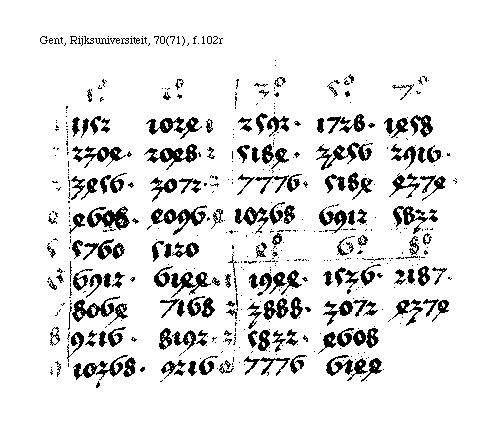 [f.102r]ex eadem tabella accipe cordam b h. scilicet 4374. et eam diuide ad medium et ueniunt 2187. et ibi habes bb. et in hoc satis fecit hec secunda proba.