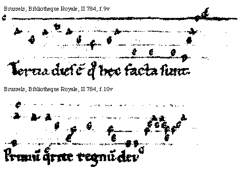 [Brussels, Bibliothèque Royale, II 784, f.14v; text: g, f, ga, a, Ad te leuaui.]