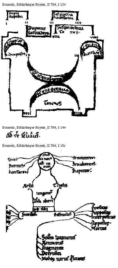 [Brussels, Bibliothèque Royale, II 784, f.12v; text: I, II, III, IIII, VIII, VIIII, Diapason, Diapente, Diatessaron, Diatesaron, Diatessaron, Tonus, Dupla, Sesqualtera, Sesquitertia, Sesquioctaua]