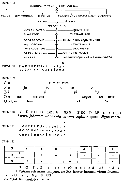 [184][CSM4:184; text: Musica motus est vocum, Tonus, Semitonium, Ditonus, Semiditonus, Diatessaron, Diapente, Arsis, Thesis, Iunguntur, Altera alteri, Ipsae sibi, Similiter, Dissimiliter, Praepositae, Secundum laxationis, Suppositae, Et acuminis, Interpositae, Augmenti, Appositae, Et detrimenti, Mixtae, Modorumque varias qualitates]