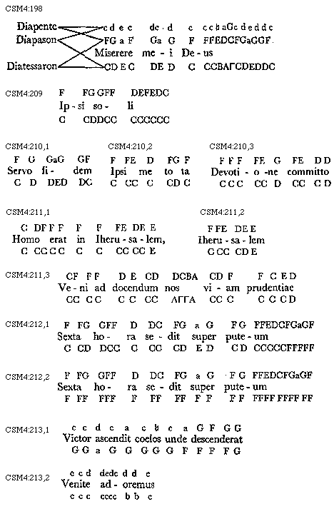 [CSM4:198; text: Diapente, Diapason, Diatessaron, [Gamma], A, B, C, D, E, F, G, a, [sqb], c, d, e, Miserere mei Deus]