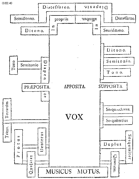 [GSII:40; text: Vox, Musicus motus. Diatessaron. Diapente. Semiditono. Ditono. Tono. Semitonio. In propriis, In affinibus. Praeposita. Apposita. Supposita. Sesquioctavus. Sesquitertius. Sesquialter. Duplus, Protus, Deuterus, Tritus. Tetrardus, Qualitas, Quantitas.]