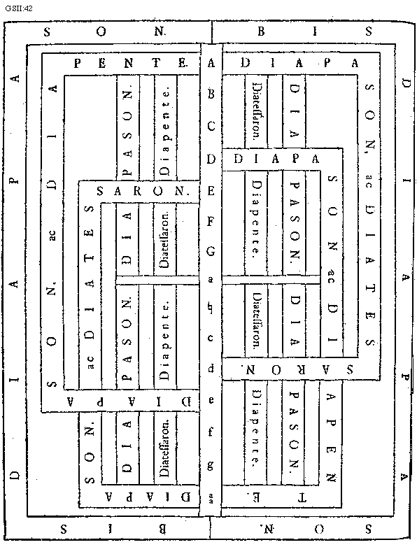 [42][GSII:42; text: BIS DIAPASON. DIAPASON ac DIAPENTE. DIAPASON ac DIATESSARON. DIAPASON. Diatessaron. Diapente. A, B, C, D, E, F, G, A, [sqb], c, d, e, f, g, aa]