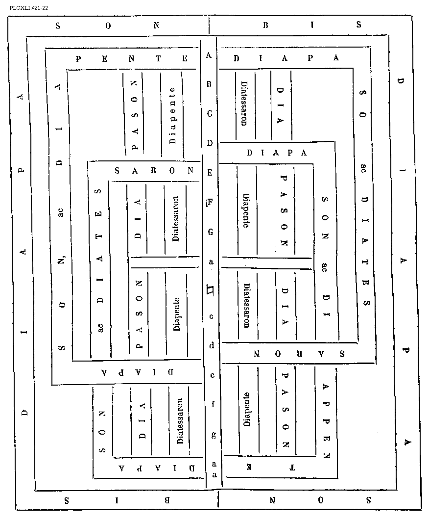 [PLCXLI:421-22; text: Bisdiapason, Diapason, ac diapente, Diapason ac diatessaron, Diapente, Diapason, Diatessaron, A, B, C, D, E, F, G, a, [sqb], c, d, e, f, g, aa]