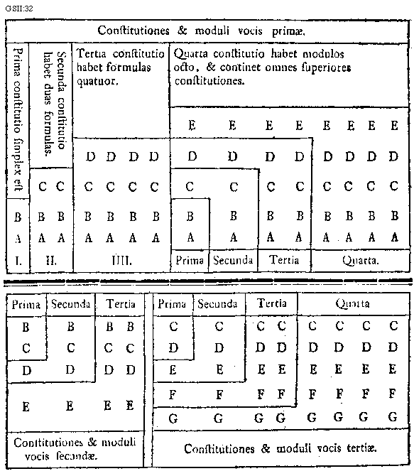 [GSII:32; text: Constitutiones et moduli vocis primae. Prima constitutio simplex est, Secunda constitutio habet duas formulas. Tertia constitutio habet formulas quatuor. Quarta constitutio habet modulos octo, et continet omnes superiores constitutiones. I. II. IIII. A, B, C, D, E, Prima, Secunda, Tertia, Quarta. Constitutiones et moduli vocis secundae. Constitutiones et moduli vocis tertiae. F, G]