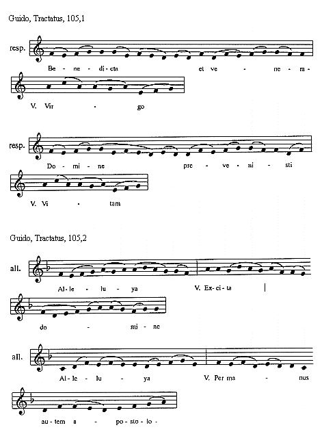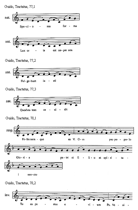[Guido, Tractatus, 101,2; text: responsorium, Diffusa est gratia, Versus, Dilexisti, Beatissimus, Et parisius]