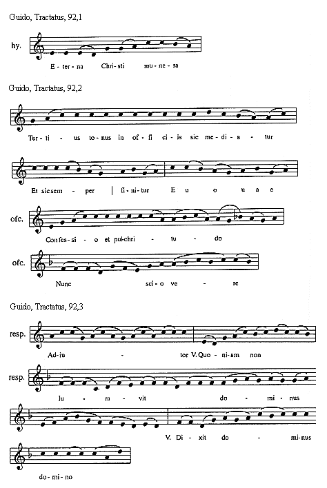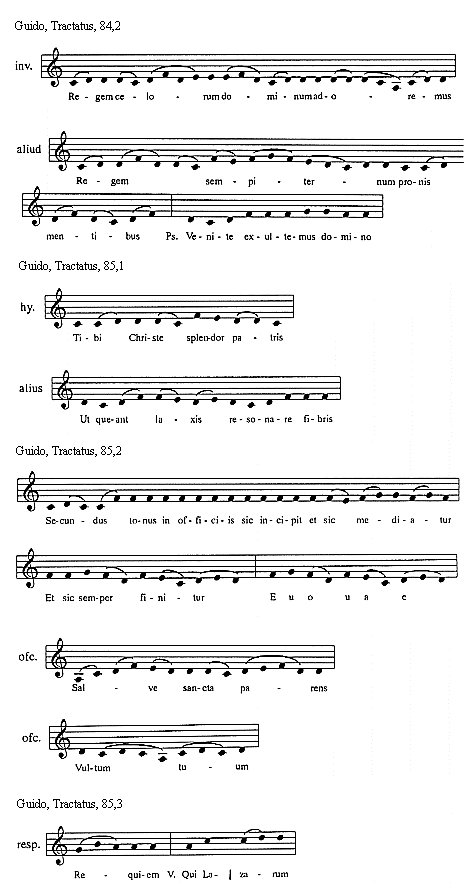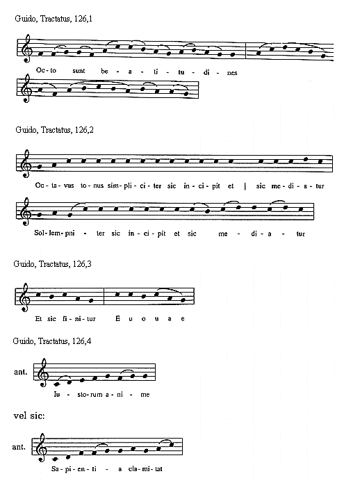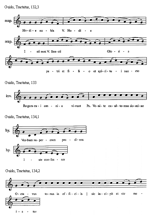 [Guido, Tractatus, 134,2; text: Octavus tonus in officiis sic incipit et sic mediatur]