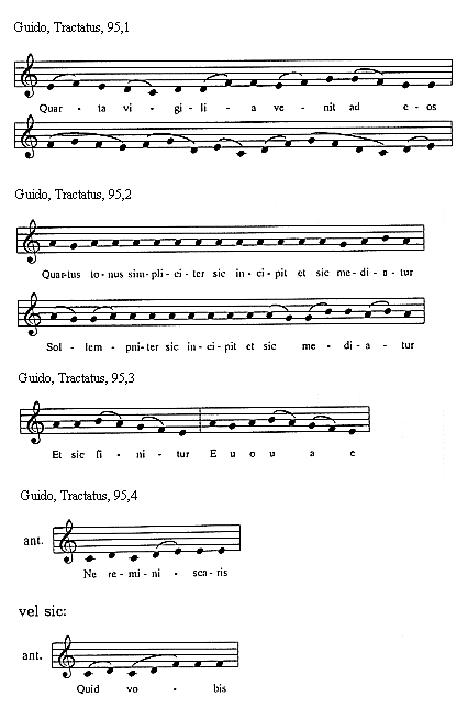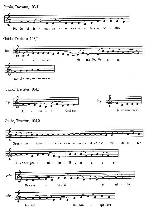 [Guido, Tractatus, 104,2; text: Quartus tonus in officiis sic incipit et sic mediatur, Et sic semper finitur, Euouae, officium, Resurrexi et adhuc, Intret in conspectu]