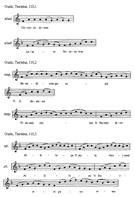 [Guido, Tractatus, 108,2; text: responsorium, Hodie nobis, Versus, Gloria in excelsis, Dum sacrum miste- Mecum, Gloria patri et filio et spiritui sancto]