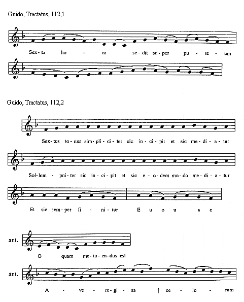 [Guido, Tractatus, 112,2; text: Sextus tonus simpliciter sic incipit et sic mediatur, Sollempniter sic incipit et sic eodem modo mediatur, Et sic semper finitur, Euouae, antiphona, O quam metuendus est, Ave regina celorum]