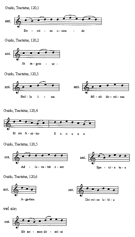 [Guido, Tractatus, 120,6; text: antiphona, Agathes, Domine labia, vel sic: Sit nomen domini]