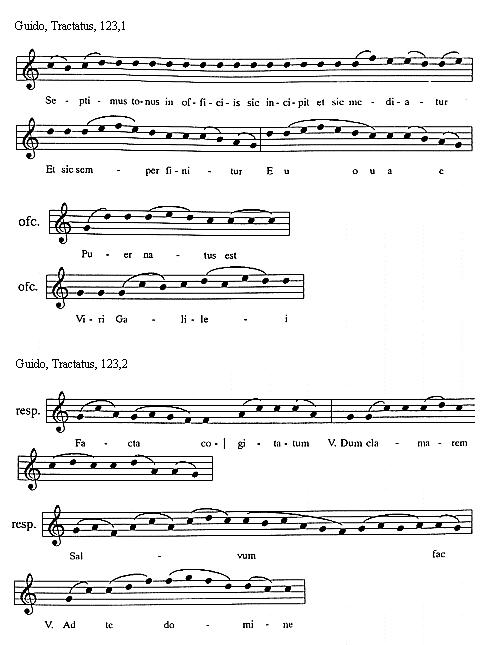 [Guido, Tractatus, 123,1; text: Septimus tonus in officiis sic incipit et sic mediatur, Et sic semper finitur, Euouae, officium, Puer natus est, Viri Galilei]