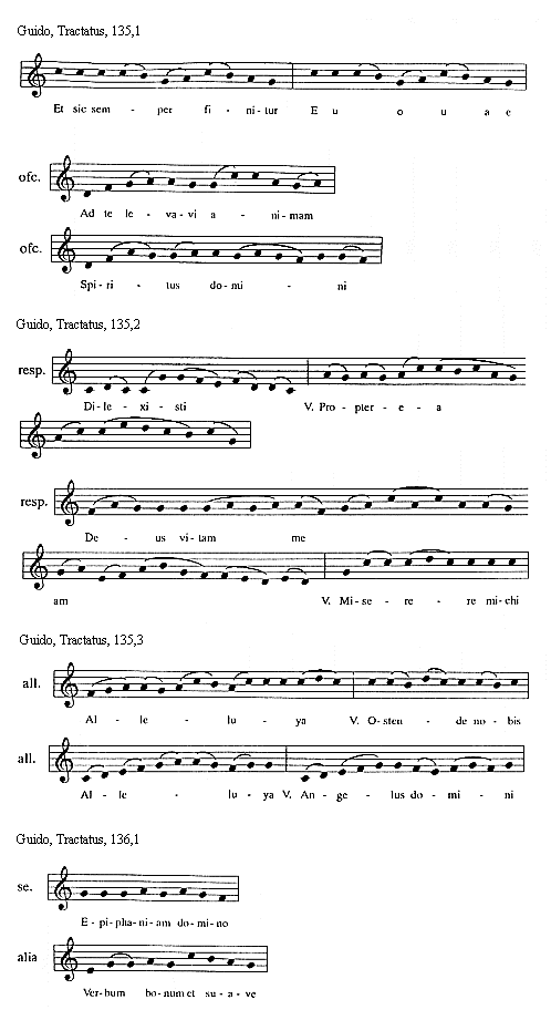 [135][Guido, Tractatus, 135,1; text: Et sic semper finitur, Euouae, officium, Ad te levavi animam, Spiritus domini]