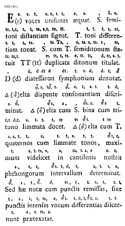 [GSII:149,1; text: E (e) voces unisonas aequat. S. semitoni distantiam signat. T. toni differentiam tonat. S. cum T. semiditonum statuit TT (tt) duplicata ditonum titulat. D (d) diatessaron symphoniam denotat. [Delta] ([Delta])elta diapente consonantiam discriminat. [Delta] ([Delta])elta cum S. bina cum tritono limmata docet. [Delta] ([Delta])elta cum T. quaternos cum limmate tonos, maximum videlcet in cantilenis nostris phthongorum intervallum determinat. Sed hae notae cum punctis remissas, sine punctis intensas vocum differentias discernunt praetexatas. tt, ts, te, et, t[Delta], [Delta]s, [Delta]t, dt]