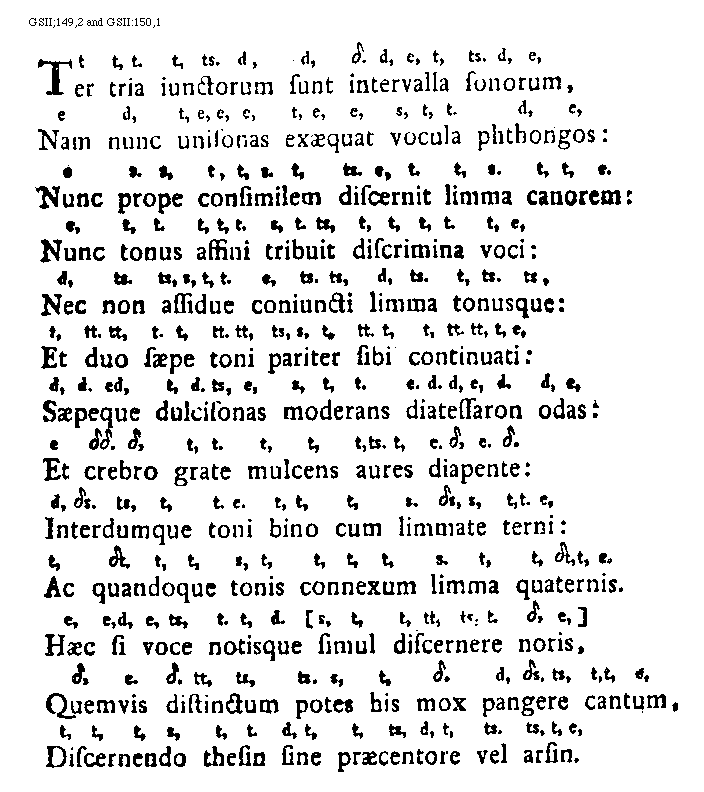 [150][GSII:150,1; text: Nunc prope consimilem discernit limma canorem: Nunc tonus affini tribuit discrimina voci: Nec non assidue coniuncti limma tonusque: Et duo saepe toni pariter sibi continuati: Saepeque dulcisonas modernans diatessaron odas: Et crebro grate mulcens aures diapente: Interdumque toni bino cum limmate terni: Ac quandoque tonis connexum limma quaternis. Haec si voce notisque simul discernere noris, Quemvis distinctum potes his mox pangere cantum, Discernendo thesin sine praecentore vel arsin. e, t, s, tt, ts, te, et, t[Delta], [Delta]s, [Delta]t, dt, [Delta][Delta]. [Delta]]