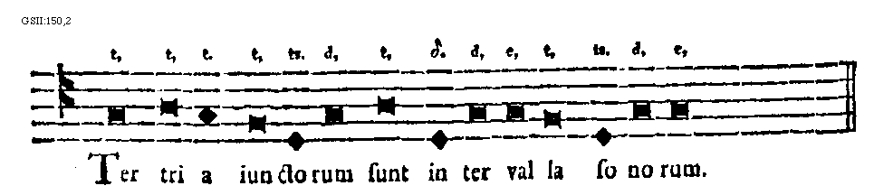 [GSII:150,2; text: Ter tria iunctorum sunt intervalla sonorum. t, ts. d, [Delta]. e,]