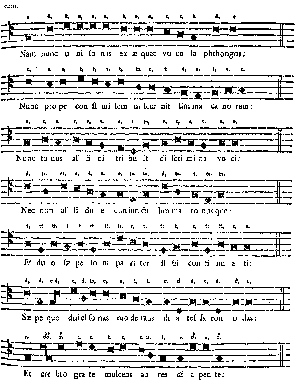 [151][GSII:151; text: Nam nunc unisonas exaequat vocula phthongos: Nunc prope consimilem discernit limma canorem: Nunc tonus affini tribuit discrimina voci: Nec non assidue coniuncti limma tonusque: Et duo saepe toni pariter sibi continuati: Saepeque dulcisonas modernans diatessaron odas: Et crebro grate mulcens aures diapente: e, d, t, s, ts. tt. [Delta], [Delta][Delta].]
