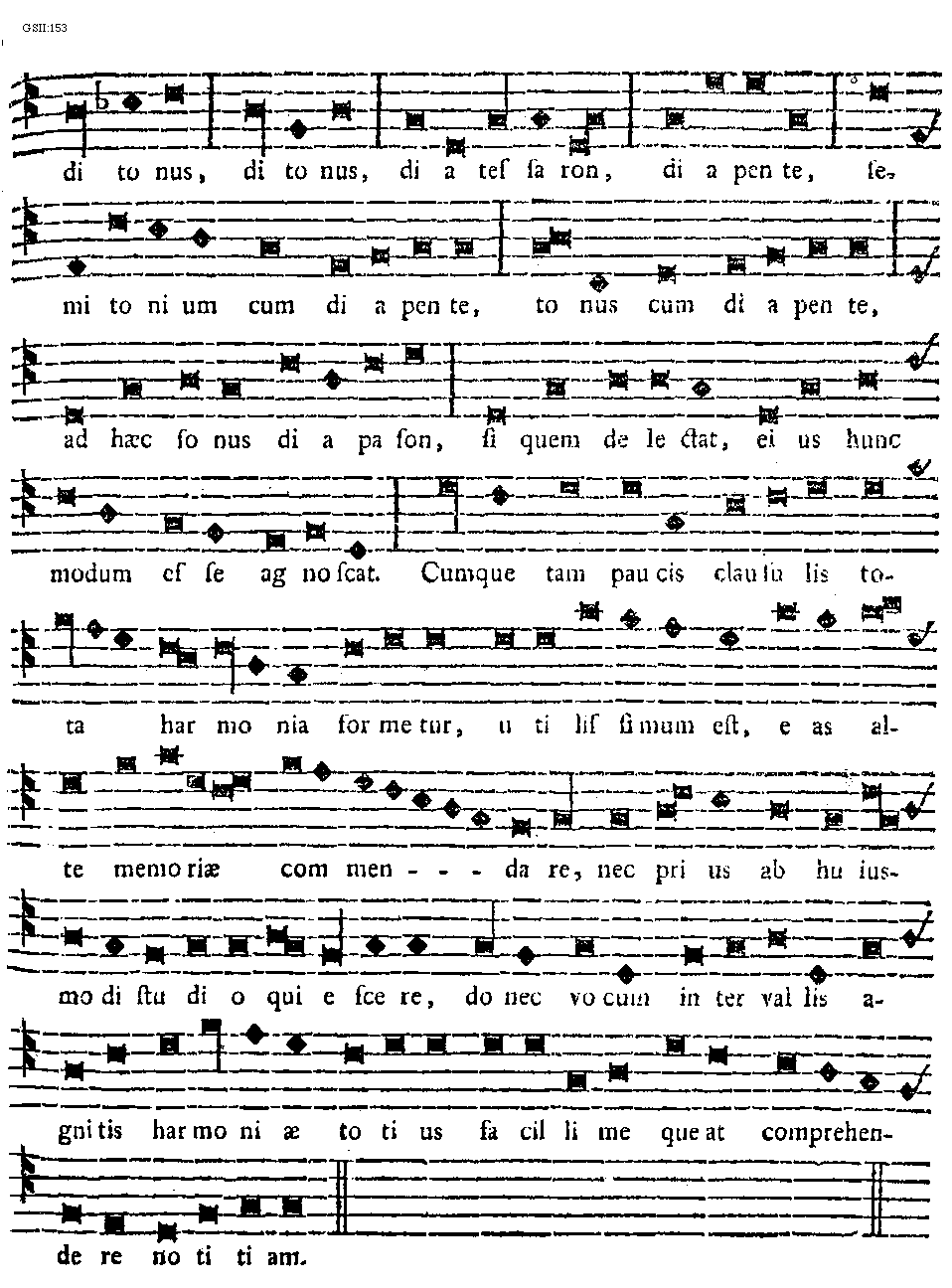 [153][GSII:153; text: ditonus, diatessaron, diapente, semitonium cum diapente, tonus cum diapente, ad haec sonus diapason, si quem delectat, eius hunc modum esse agnoscat. Cumque tam paucis clausulis tota harmonia formetur, utilissimum est, eas alte memoriae commendare, nec prius ab huiusmodi studio quiescere, donec vocum intervallis agnitis harmoniae totius facillime queat comprehendere notitiam.]