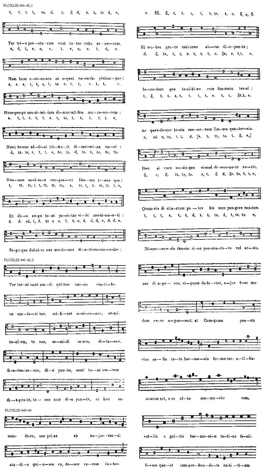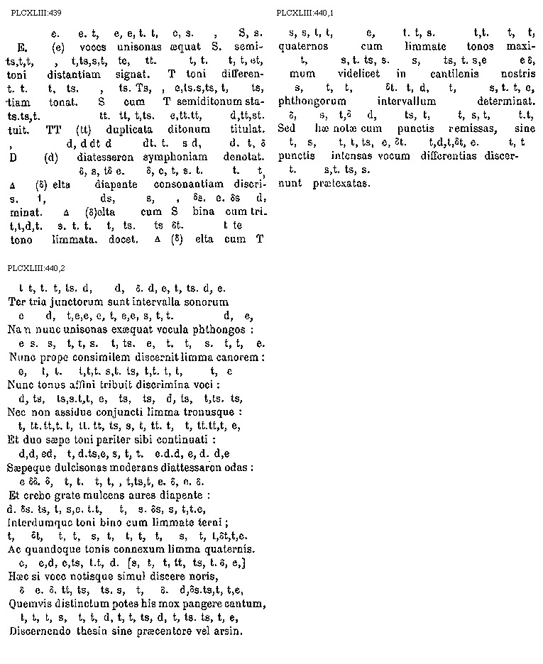 [PLCXLIII:441-42,1; text: Ter tria junctorum sunt intervaba sonorum. Nam hunc unisonas exaequat vocula phthongos: Nunc prope consimilem discernit limma canorem: Nunc tonus affini tribuit discrimina voci: Necnon assitue conjuncti limma tenusque: Et duo saepe toni pariter sibi continuati: Sepeque dulcisonas moderans diatissaron odas: Et crebro grate mulcens aures diapente: Interdumque tonibino cum limmate terni: Ac quandoque tonis connexum limma quaternis. Haec si voce notisque simul discernere noris, Quemvis distinctum potes his mox pangere cantum Discernendo thesin sine proecentore vel arsin. t, s, ts, d, [Delta], e, tt, ed, [Delta][Delta], [Delta]s, [Delta]t]