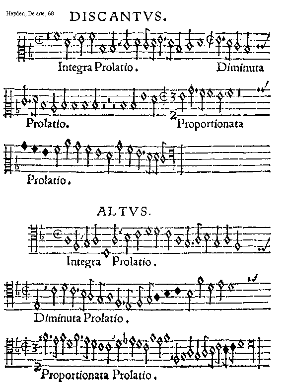 [Heyden, De arte, 68; text: DISCANTVS. Integra Prolatio. Diminuta Prolatio. Proportionata Prolatio. ALTVS]