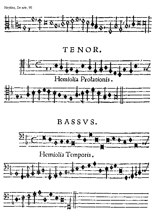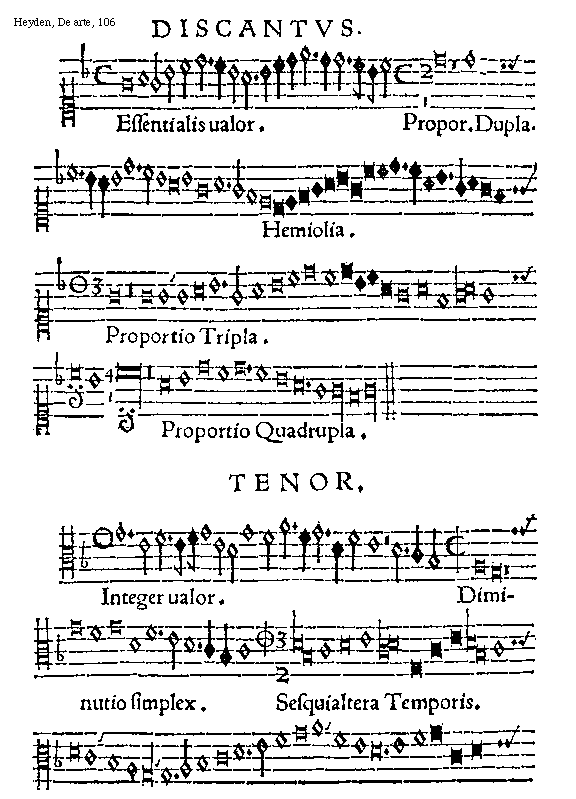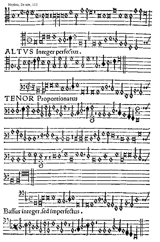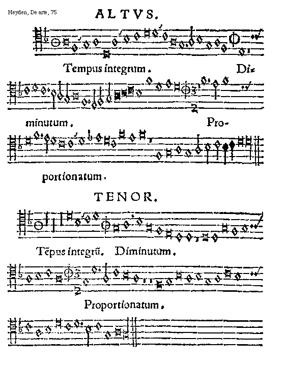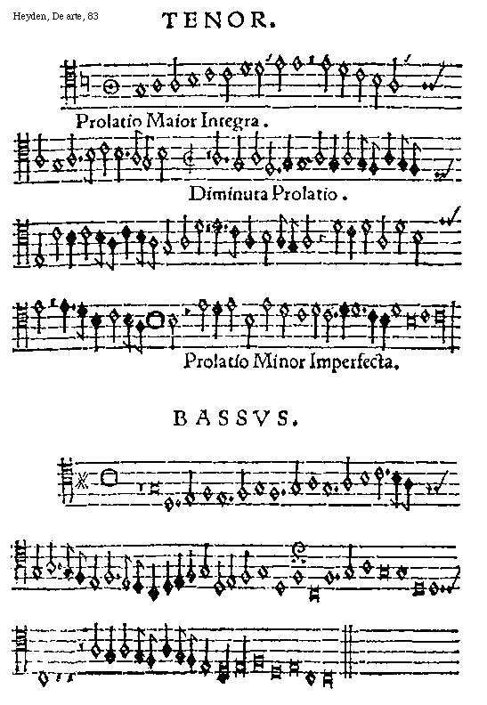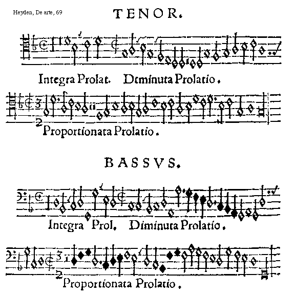 [69][Heyden, De arte, 69; text: TENOR. Integra Prolatio. Dtminuta Prolatio. Proportionata Prolatio. BASSVS, Diminuta Prolatio.]